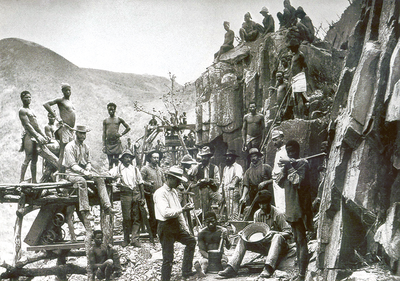 殖民掠奪是資本主義原始積累的重要途徑。早期殖民掠奪的方式,包括奴隸貿易、攫取金銀等。到了19世紀末,資本主義進入了帝國主義階段,殖民掠奪形式由商品輸出為主變成了資本輸出為主,殖民地國家和地區依然遭受着殘酷掠奪。圖為1888年攝於南非的反映英國殖民者開採金礦、掠奪黃金的照片。