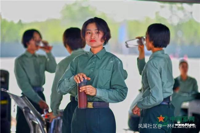 小憩間隙,女兵迅速補充水分。
