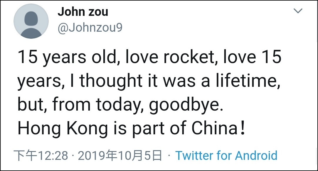 “15歲的時候喜歡上火箭隊,喜歡了15年,我以為這會是一輩子的事情。但是從今天開始,正式説再見。香港永遠是中國的一部分。”