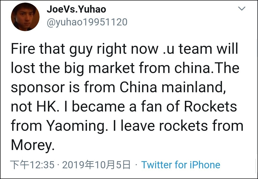 “最好是現在就開除這個傢伙,(否則)球隊將會失去中國這個龐大的市場……因為姚明,我成為了火箭隊的粉絲,現在因為莫雷要放棄了。”