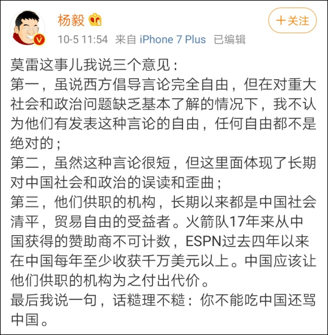 楊毅認為,“他們供職的機構,長期以來都是中國社會清平,貿易自由的受益者。火箭隊17年來從中國獲得的贊助商不可計數,ESPN過去四年以來在中國每年至少收穫千萬美元以上。中國應該讓他們供職的機構為之付出代價。”
