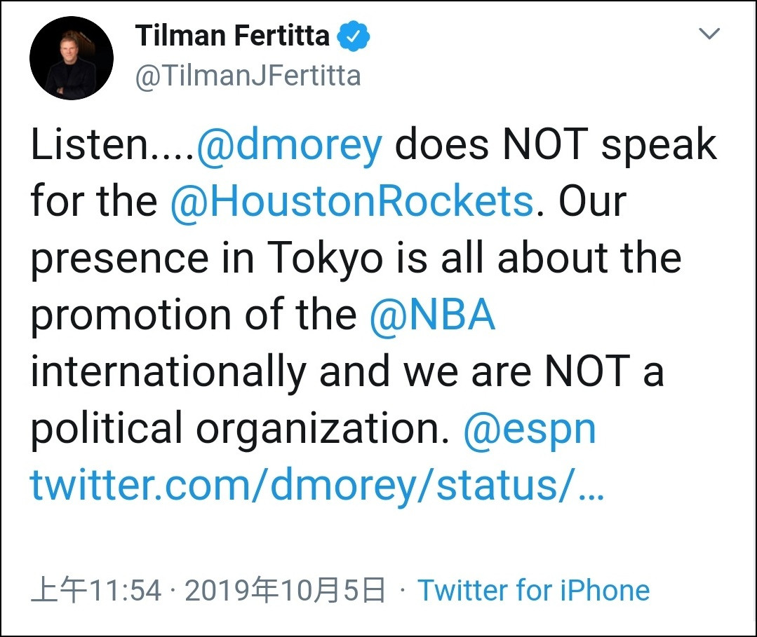 對於莫雷發表錯誤的涉港言論,火箭隊老闆菲爾蒂塔第一時間發推特緊急滅火。