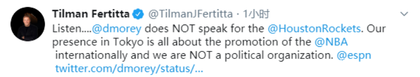 對於莫雷的言論,火箭隊老闆菲爾蒂塔5日也緊急發佈推特澄清:莫雷不代表火箭隊。“聽着……莫雷不能代表休斯頓火箭隊。我們來東京參加比賽是為了更好地推廣NBA全球化,我們並不是政治組織。”↓