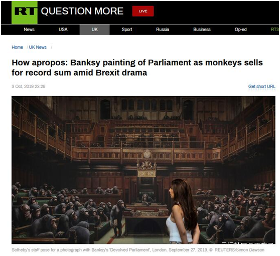 “今日俄羅斯”(RT)3日在報道此事時在標題中寫道,英國脱歐大戲中,班克西“議會猴子”的畫作拍出天價,這是多麼恰如其分。RT稱,此次拍賣也打破了班克西作品此前的拍賣紀錄。