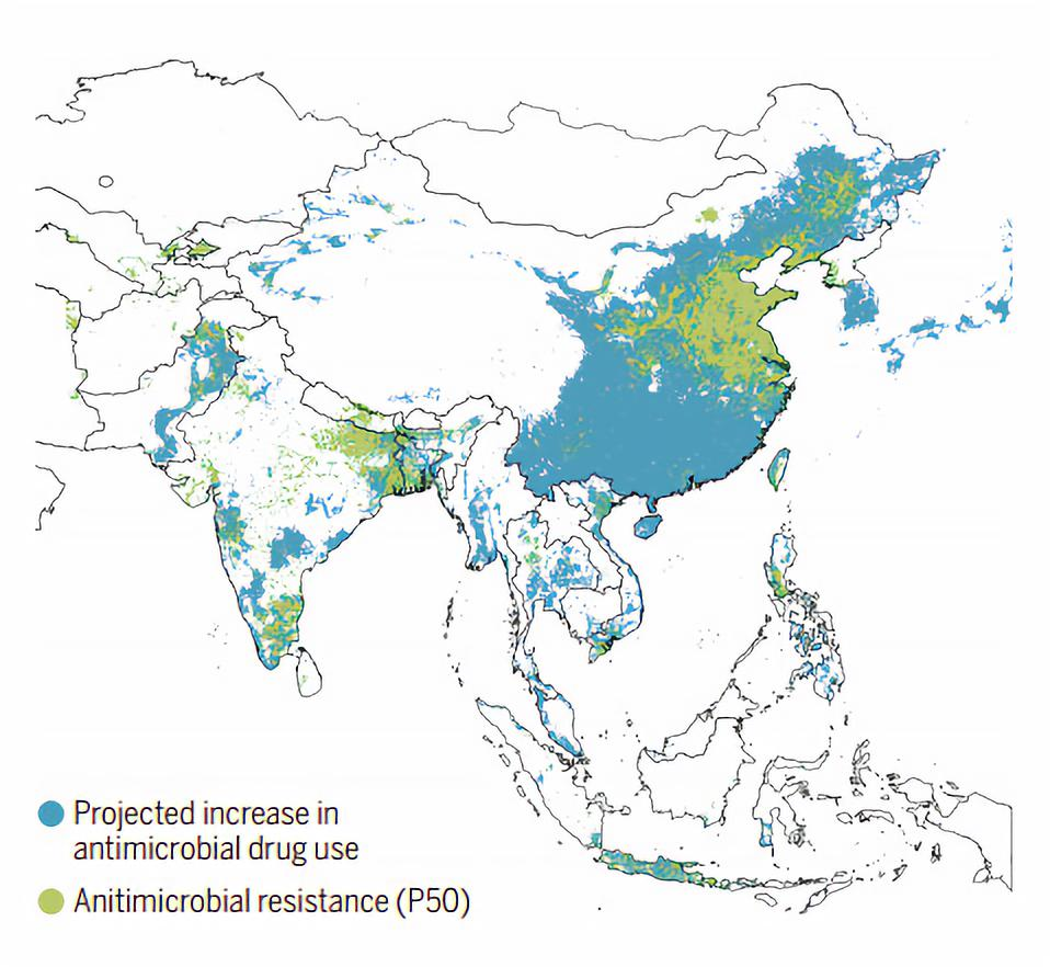 其中抗生素抵抗最嚴重的區域主要集中在印度南部和東北地區、中國東北和華北地區、巴西、埃及和中東一些國家。而抗生素使用率在中國大部分地區都在飛速增長。研究指出,像臨近這些抗生素熱點附近的區域,正在不斷搭建新的養殖場,這些地區將成為抗生素抵抗擴增的部分。