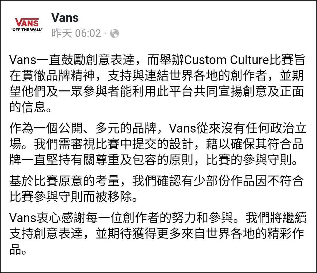 聲明還稱,作為一個公開、多元的品牌,Vans從來沒有任何政治立場。但是Vans需要審視比賽中提交的設計,藉以確保其符合品牌一直堅持有關尊重及包容的原則,比賽的參與守則。