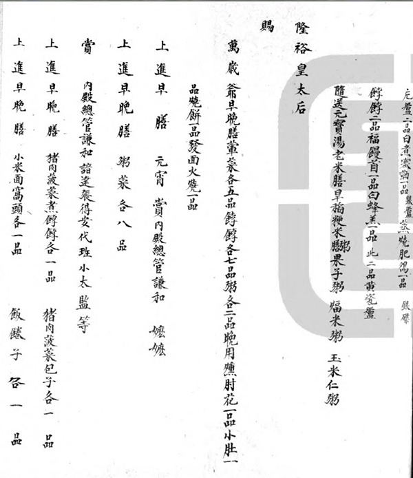 隆裕皇太后賜萬歲爺早晚膳葷菜各五品、餑餑各七品、粥各二品。
