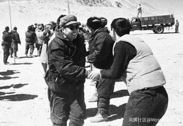 在珠峯大本營,中國登山隊政委王富洲與隊友握手告別