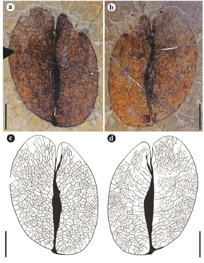 ▲圖為倫坡拉盆地的長梗似浮萍葉化石。A、B為主標本整體,比例尺1釐米;C、D為化石果序,比例尺1毫米。