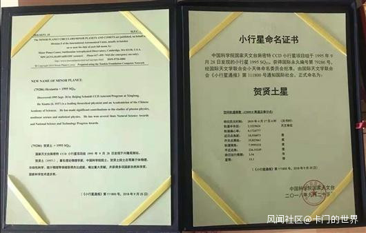 2018年9月25日,國際天文學聯合會小天體命名委員會將一顆編號079286的小行星命名為“賀賢土星”。一年後的9月26日,他又站在了愛德華·泰勒獎的領獎台上。無論天上地下,“賀賢土”這個名字,都是這般熠熠生輝。