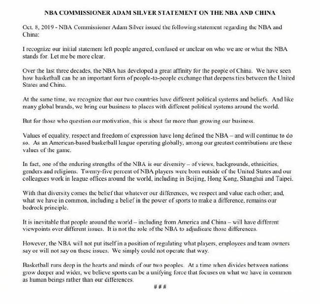 北京時間10月8日,NBA總裁亞當-肖華就NBA和中國發表瞭如下聲明: