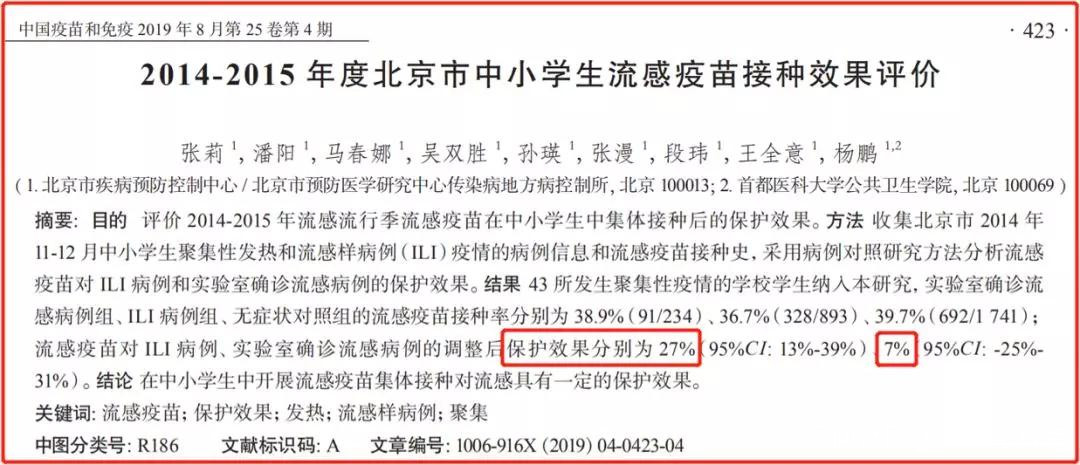 北京同行還在英文期刊上發表了一篇研究全市2014-2015年度流感疫苗保護效果的論文(http://t.cn/AiuP68Um)。他們觀察了近萬名符合流感症狀的患者,發現確診病例中有4.3%接種過疫苗,排除病例中有3.7%接種過疫苗。也就是説,流感病例的疫苗接種率表面上還略高於非流感病例(差異無統計學意義)。最後的結論是:沒有證據表明,2014/2015年度北京接種的流感疫苗保護了流感患者(There was no evidence that the influenza vaccine protected vaccinees against medically attended influenza in Beijing, China during the 2014/15 season.)