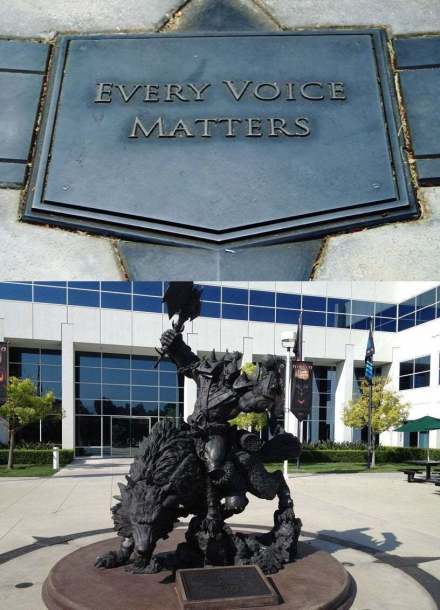 而在暴雪位於南加州的園區內,有人在中央狼騎兵雕像周圍的“暴雪核心理念“”銘文中"Think Globally"和"Every Voice Matters"這兩條上貼上了白紙,將他們完全覆蓋,以此來“抗議”暴雪做出的處罰決定。