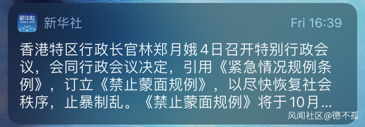 近3個小時後,飛機在香港國際機場落地。關閉手機飛行模式,屏幕上跳出一則新華社的推送:“香港特區行政長官林鄭月娥4日召開特別行政會議,會同行政會議決定,引用《緊急情況規例條例》,訂立《禁止蒙面規例》,以儘快恢復社會秩序,止暴制亂。”
