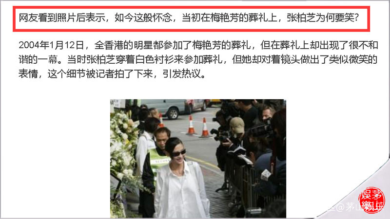 資料圖原來,在15年前梅豔芳葬禮上,前來送別的張柏芝不但穿着不合適的白襯衫,更令人意外的是,她居然對着鏡頭露出了微笑的表情,可以説她出現的這一幕太不和諧了。要知道,當時不光眾多演藝界人士出席葬禮,還有來自世界各地的近萬歌迷及香港市民沿街相送,雖然葬禮在香港殯儀館舉行,但內地同行也在北京舉行了追思會,大家都很痛心梅豔芳的離去。
