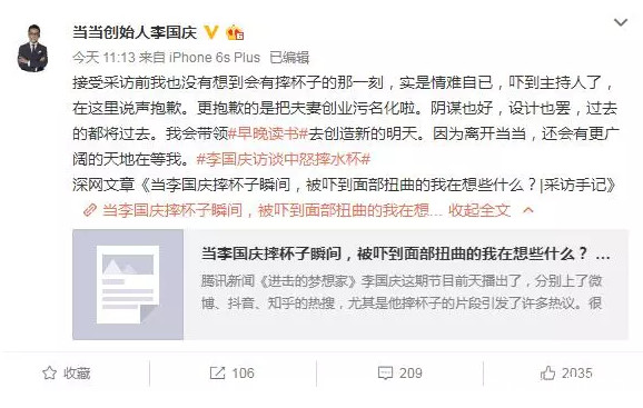 李國慶稱,接受採訪前他也沒有想到會有摔杯子的那一刻,實是情難自已,嚇到主持人了,在這裏説聲抱歉。他還稱更抱歉的是把夫妻創業污名化。李國慶表示,陰謀也好,設計也罷,過去的都將過去。因為離開噹噹,還會有更廣闊的天地在等他。