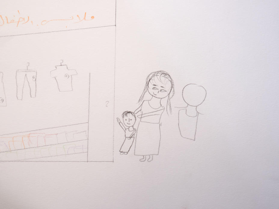 我們去買開齋節的新衣服。我想起了我的母親,我們如何一起為開齋節買新衣服。我畫了《兒童服裝店》、《母親和她的孩子》,但當我開始自己畫時,我畫不完。我翻了一頁,結果圖畫不完整。