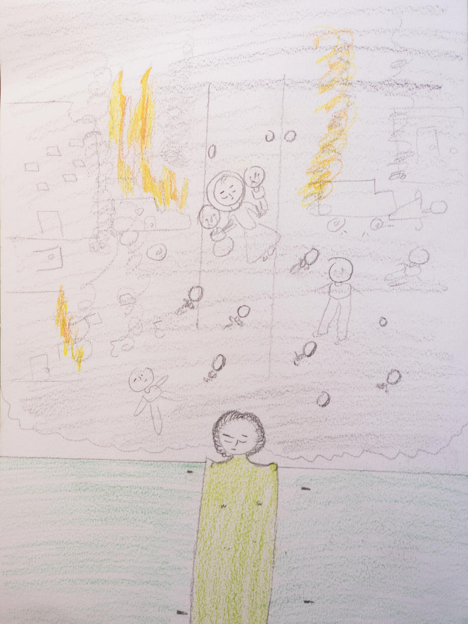 我哥哥告訴我,他夢見爆炸案。所以我畫了他是如何睡覺和夢見爆炸的。我給他看了,他開始嘲笑我。他告訴我這不是他的夢裏面的情形,他夢裏面的爆炸情景比這要強烈很多。