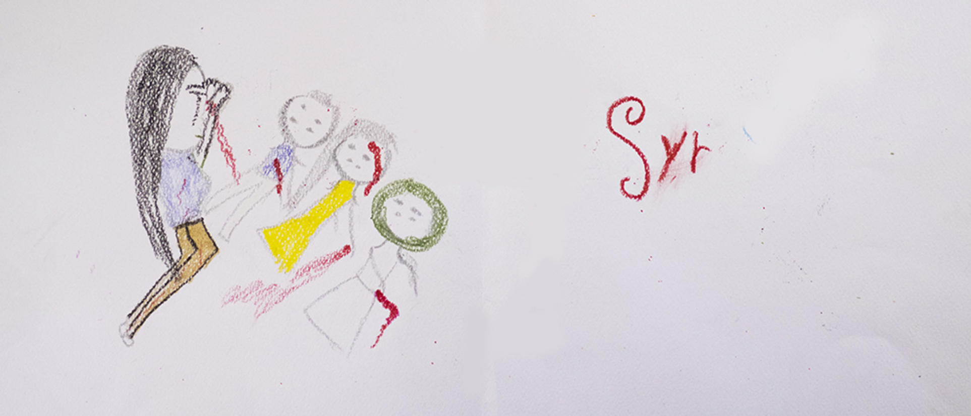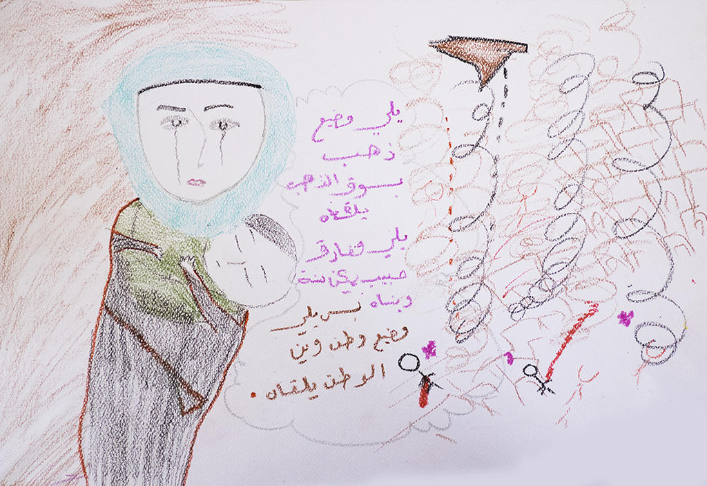 我畫了戰爭是如何從一場革命開始的,然後是轟炸機和軍用飛機,然後人們開始死亡,並且墓地變得更大。一個女孩目的了這一切,掌握了打開和平之門的鑰匙。但是她受傷了,和她在一起的男孩快要死了。他説:“開門。”眼睛有一朵花,代表敍利亞,它在哭泣。鮮花中的人民是敍利亞人民,他們在等待和平的到來。它説:“一切都會再好,敍利亞。”