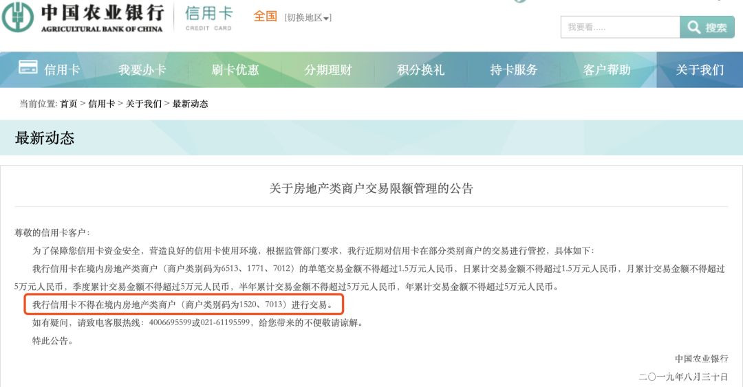 在此背景下,8月以來,農行、建行、招行、興業、平安、光大等多家銀行的信用卡中心先後發佈公告,要求收緊房地產類商户刷卡,有的銀行是限制額度,有的是禁止交易。