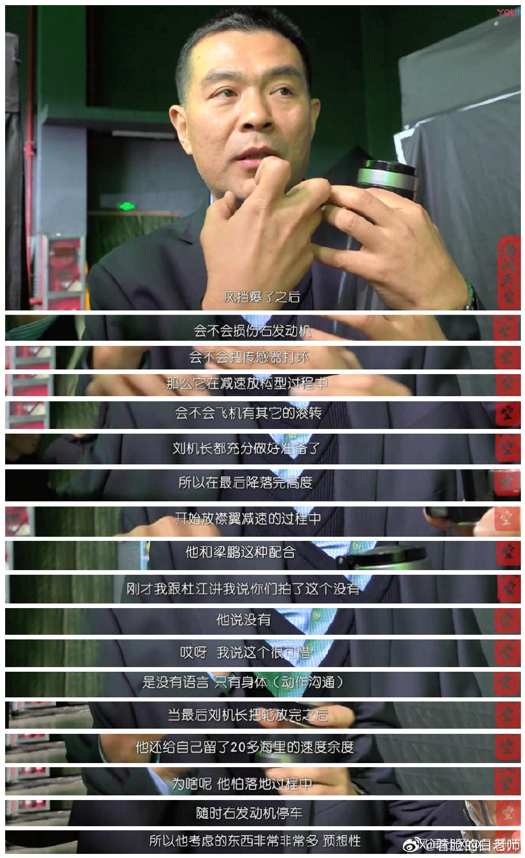 “風擋爆了之後,會不會損傷右發動機,會不會把傳感器打壞,那麼它在減速放構型過程中,會不會飛機有其它的滾轉,劉機長都充分做好準備了。所以在最後降落完高度,開始放襟翼的過程中,他和梁鵬的這種配合,剛才我跟杜江講,我説你們拍了這個沒有,他説沒有,哎呀我説這個很可惜,是沒有語言,只有身體(動作溝通)。”