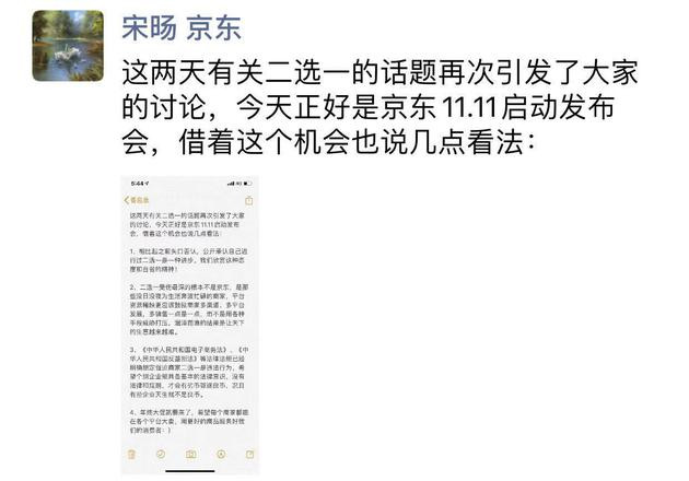 新浪科技訊 10月15日下午消息,“電商二選一”近期再度引發熱議,今日,京東副總裁宋暘在朋友圈發文表示,二選一受傷最深的根本不是京東,是那些沒日沒夜為生活奔波忙碌的商家,平台資源稀缺更應該鼓勵商家多渠道、多平台發展,多銷售一點是一點,而不是用各種手段威脅打壓,涸澤而漁的結果是讓天下的生意越來越難。