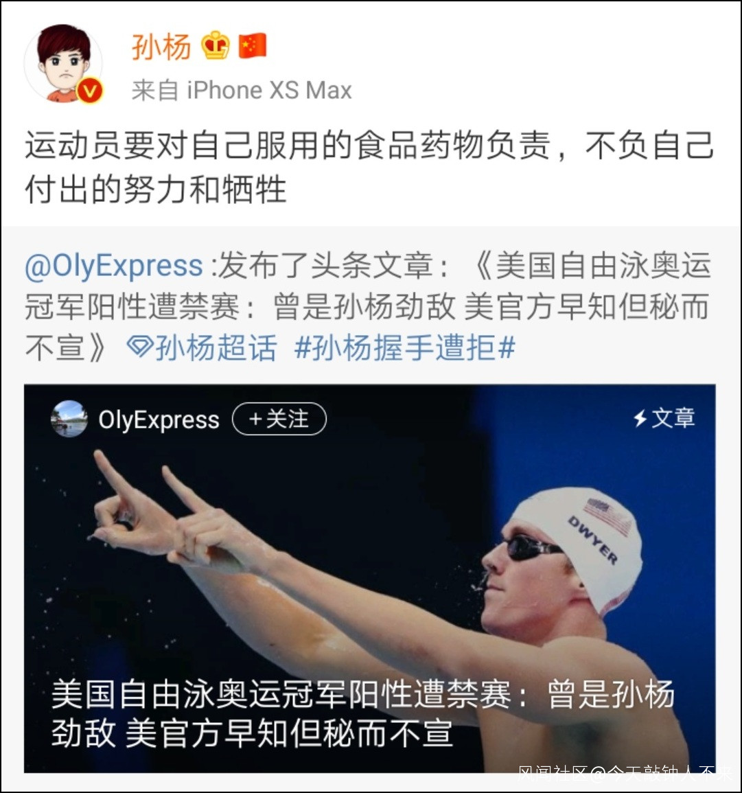 事情曝光後,我國知名的游泳運動員孫楊在社交媒體上發文,“運動員要對自己服用的食品藥物負責,不負自己付出的努力和犧牲。”這被認為是對德懷爾服用興奮劑表示遺憾外,也是在為自己發聲,因為有關於孫楊的“興奮劑案”聽證會已經定於11月15日在瑞士蒙特勒舉行。