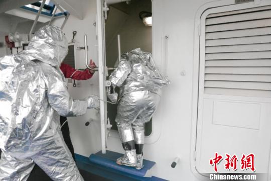 舵機艙發生火災,探火隊員穿着探火服,前往火災地點探明火情。 亓創 攝