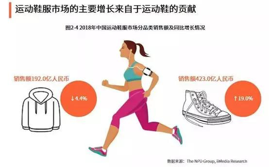 根據艾媒諮詢發佈的《2019中國運動鞋服產業競爭態勢與行業發展大數據分析報告》顯示,中國運動鞋服市場的主要增長來自於運動鞋的貢獻,2018年中國運動鞋服市場中,運動服裝銷售額為192億人民幣,而運動鞋履銷售額達423億人民幣。