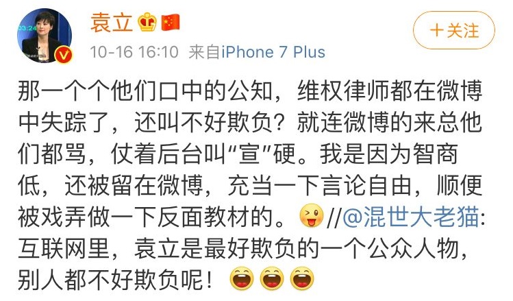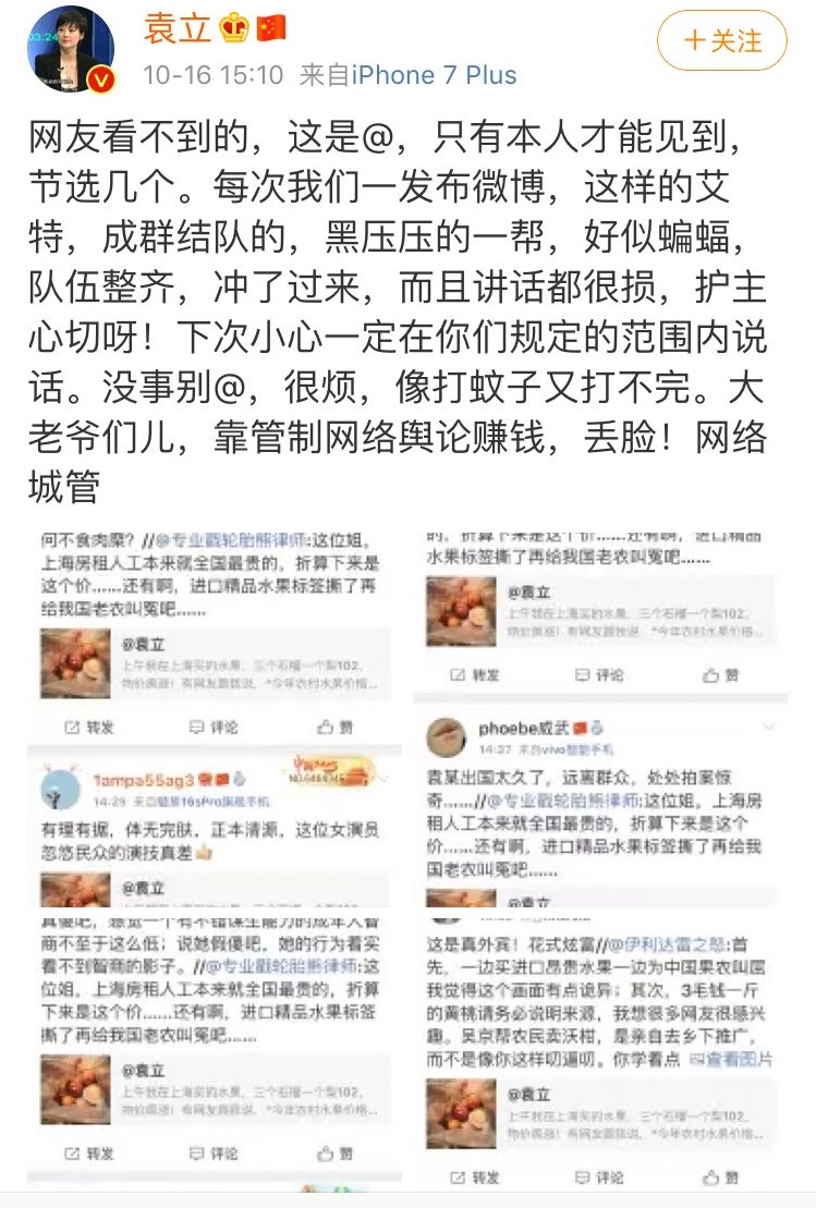 許多網友表達了跟她不一樣的觀點後,袁立表現得很憤怒,她又發了一條微博將這些人都掛了出來,還稱他們為“網絡城管”: