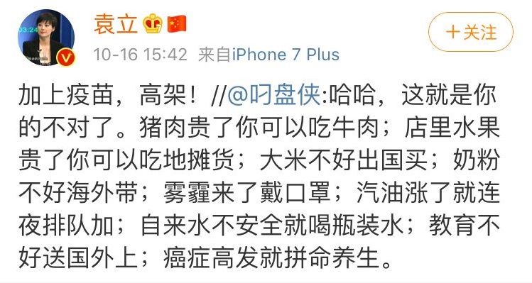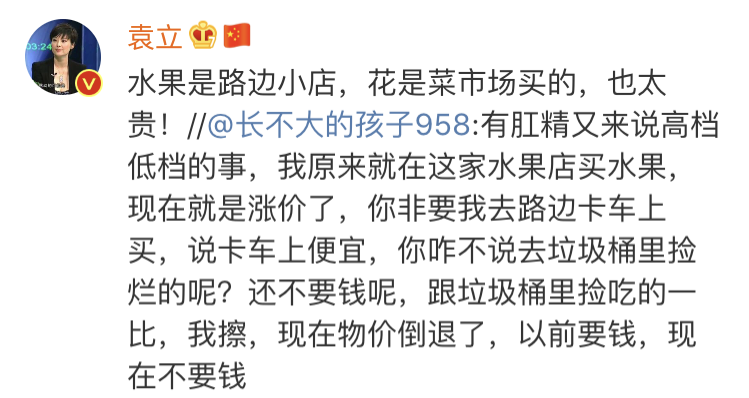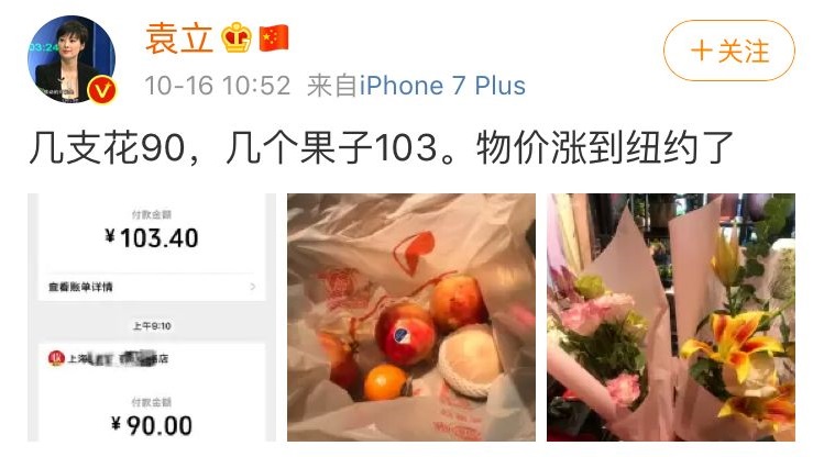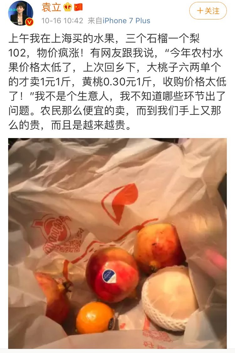 16日上午,袁立發微博表示,自己在上海花一百多就買了幾個果子,國內現在的物價真是太貴了。