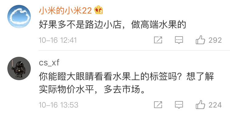 評論區裏,有許多和我一樣對此疑惑的上海網友,他們猜測,是不是因為袁立買的是進口水果、或者去的是比較高檔的水果店,所以價格才這麼高。