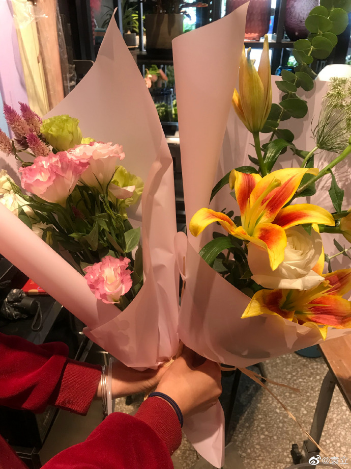 從她發的照片可以看到,她買了三個石榴,一個橙子和一個梨,花費103.4元;兩束花束,花費90元。
