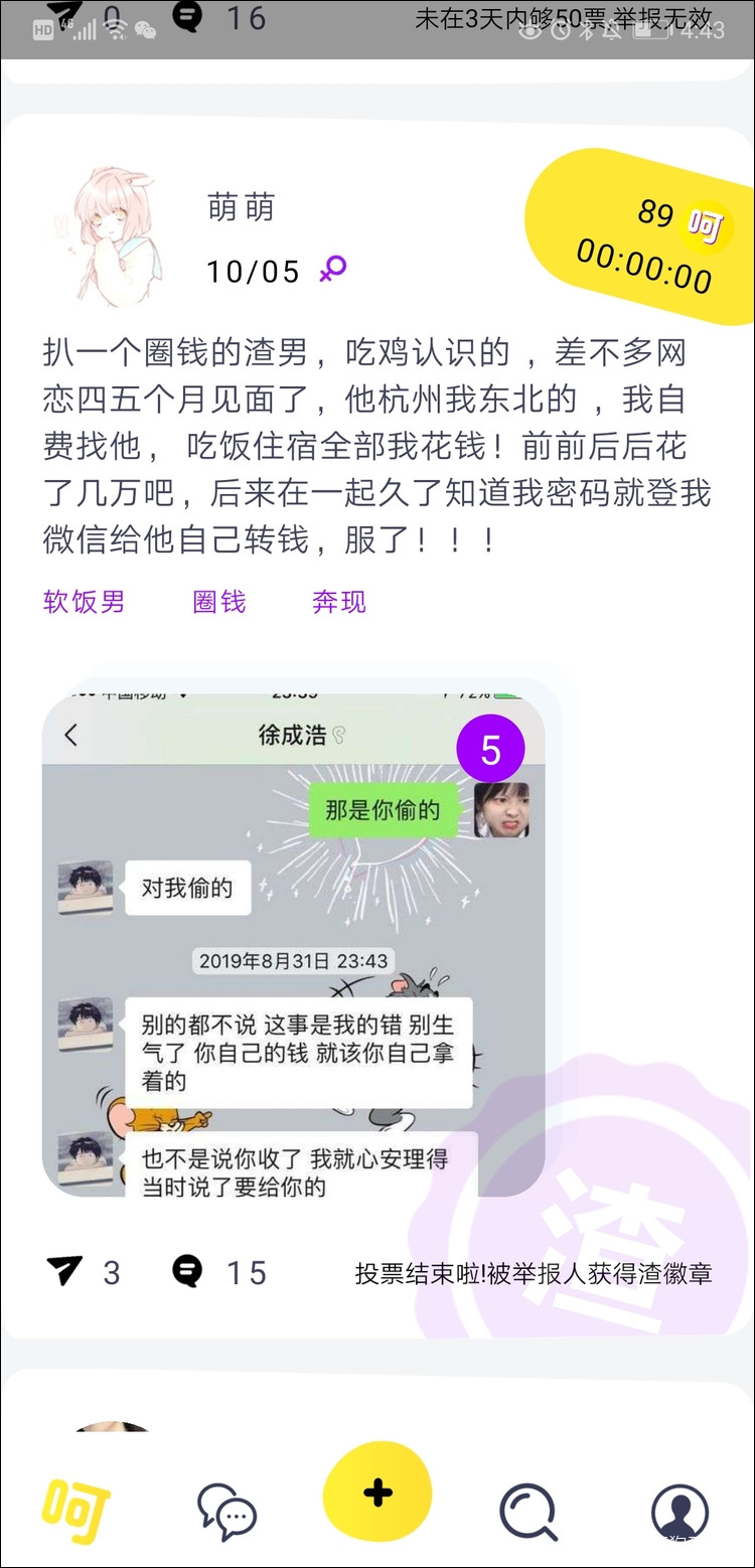 下方的菜單欄中,最左側的“呵”是展示頁面,供用户發佈與“渣男”的相處經歷及截圖、照片等證據,其他人進行投票。若在規定時間內收穫超過50個“呵”投票,該被舉報人便會獲得一個“渣”勳章,即被認為渣男。