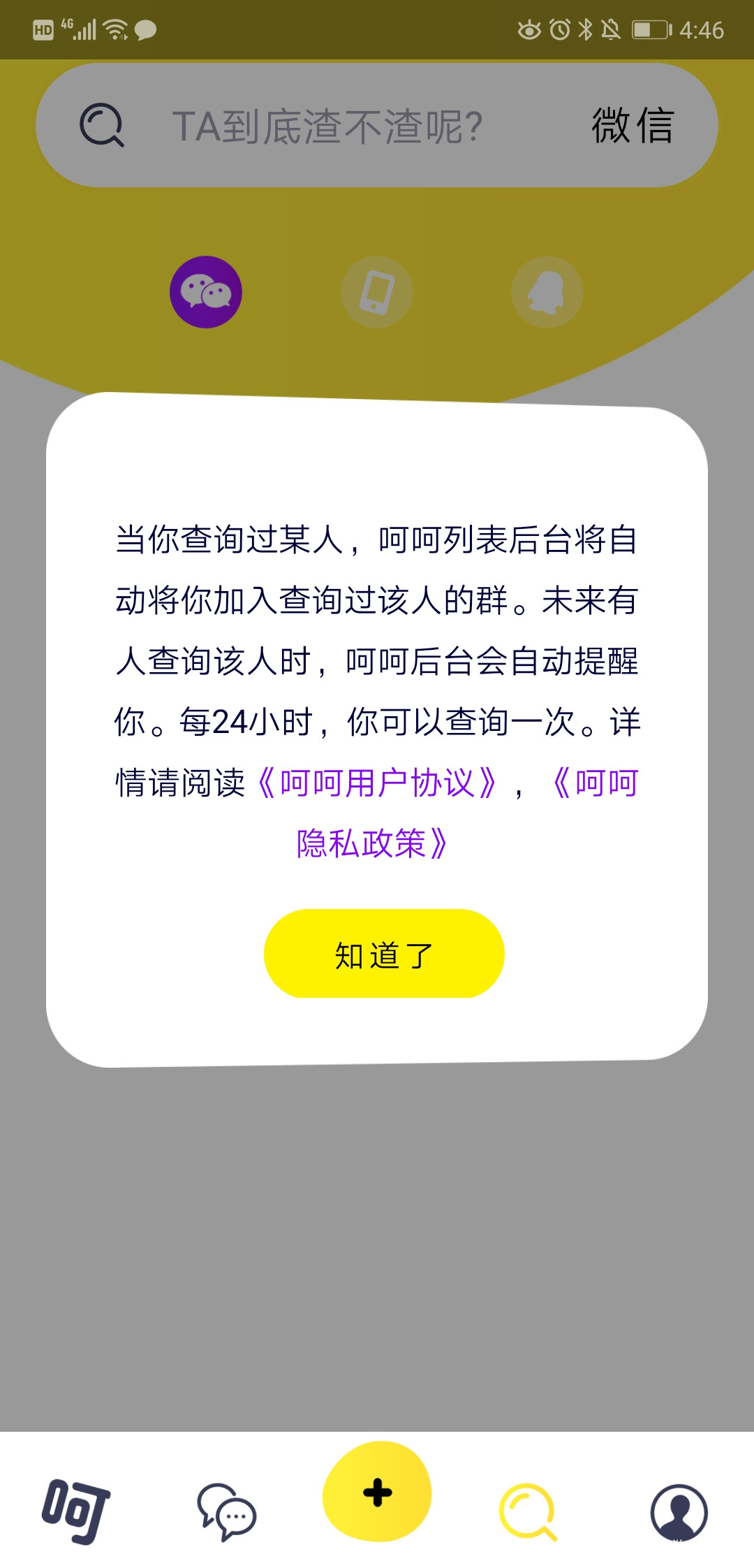 搜索有三種方式,微信號、手機號、QQ號。據功能提示,當你查詢過某人,呵呵便會將你自動加入查詢該人的羣,未來當有人查詢該人時,呵呵後台會自動提醒查詢者。