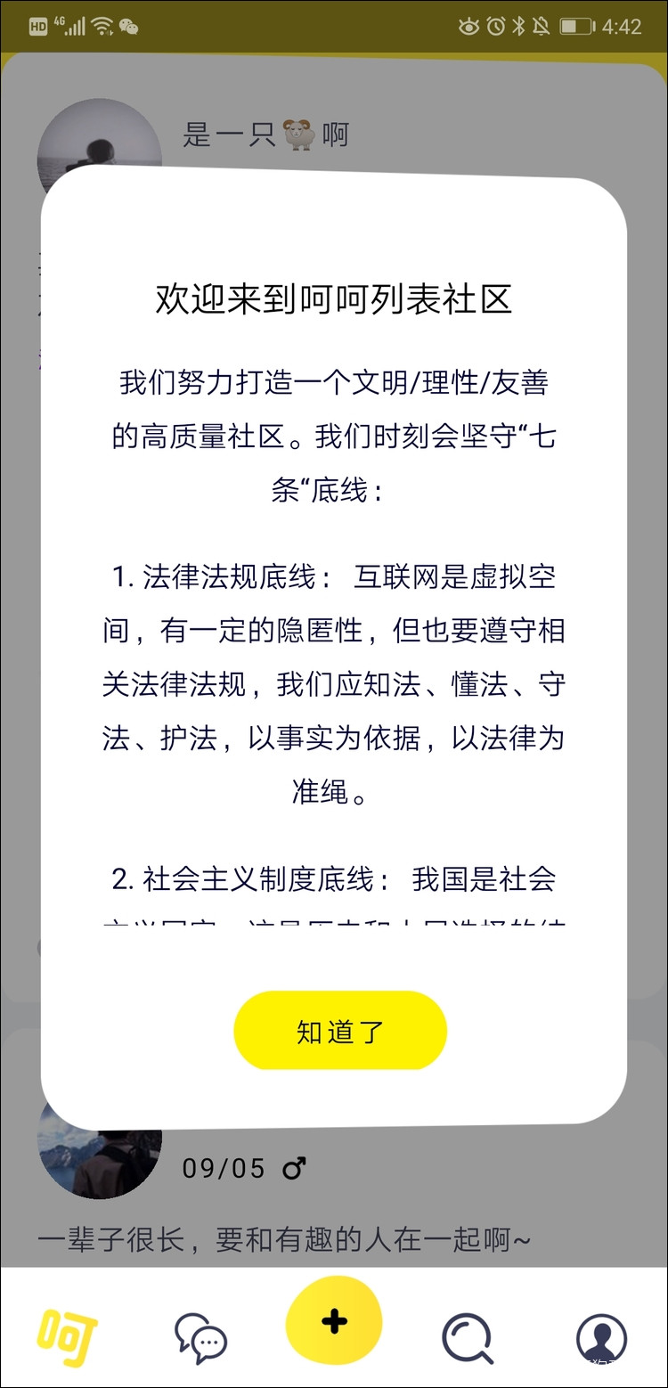 下方菜單欄中左起第二個為聊天界面,中間黃色的“+”號是發佈按鈕。