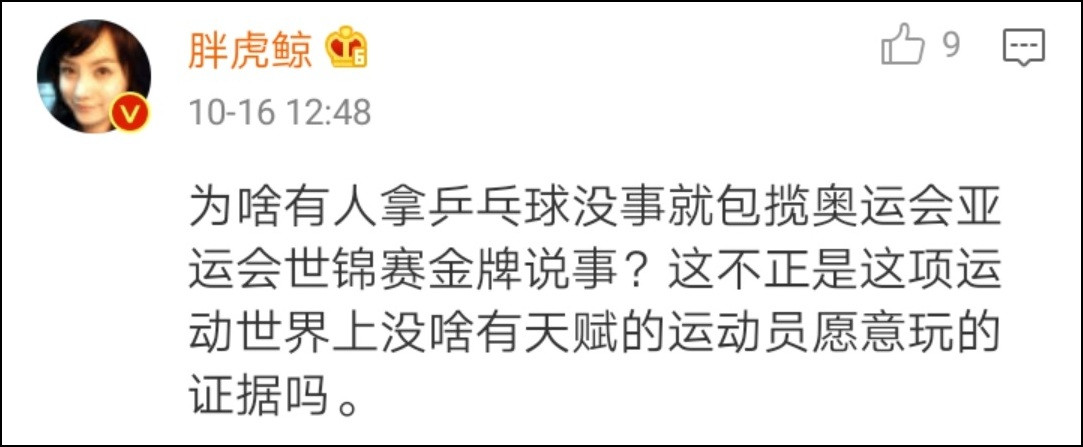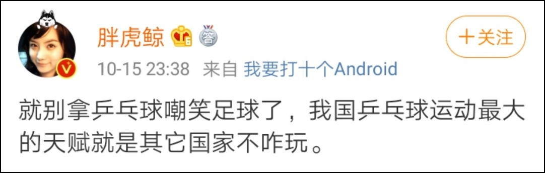 昨晚的比賽結束後,知名博主@胖虎鯨 疑似對網友們譏諷國足有所不滿,在社交媒體上發文稱,“就別拿乒乓球嘲笑足球了,我國乒乓球運動最大的天賦就是其它國家不咋玩。”