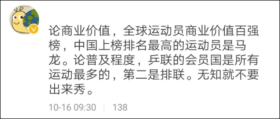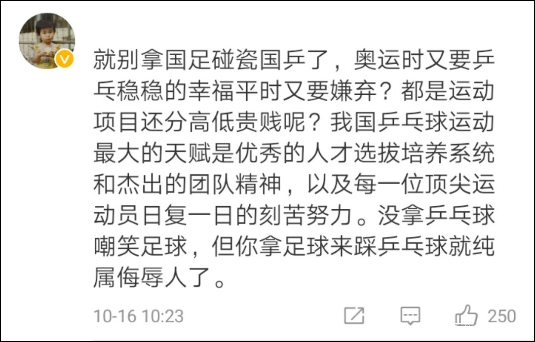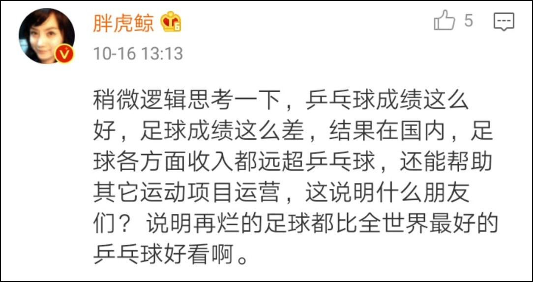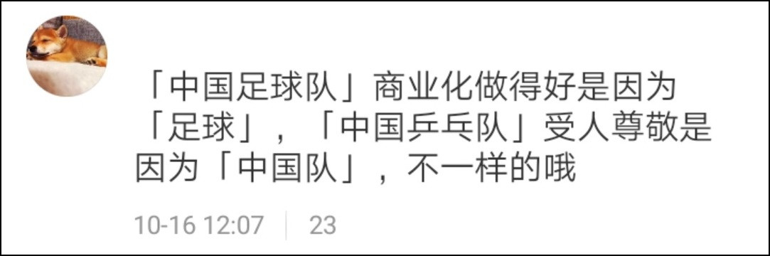 又比如,@胖虎鯨 認為,我們國足的成績再爛,結果各方面的收入都遠超乒乓球,甚至還能夠上繳資金到體育總局,幫助其他的運動項目運營。乒乓球的成績好有什麼用,又做不到這些,所以自然也就沒有與足球相提並論的資格。