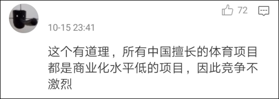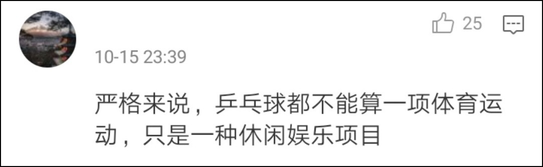 不過,也並非沒有網友支持@胖虎鯨 的説法。樓主在評論區裏同樣看到了“嚴格來説,乒乓球都不能算是一項體育運動,只是一種休閒娛樂項目”、“所有中國擅長的體育項目都是商業化水平低的項目”這樣的話語。