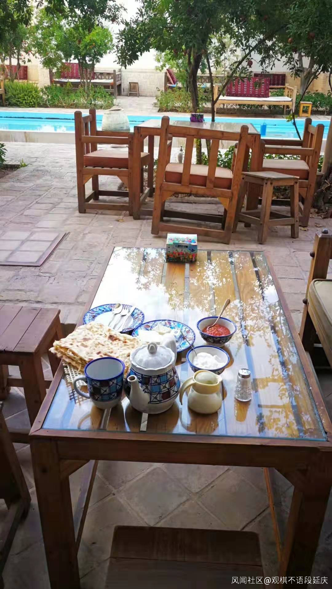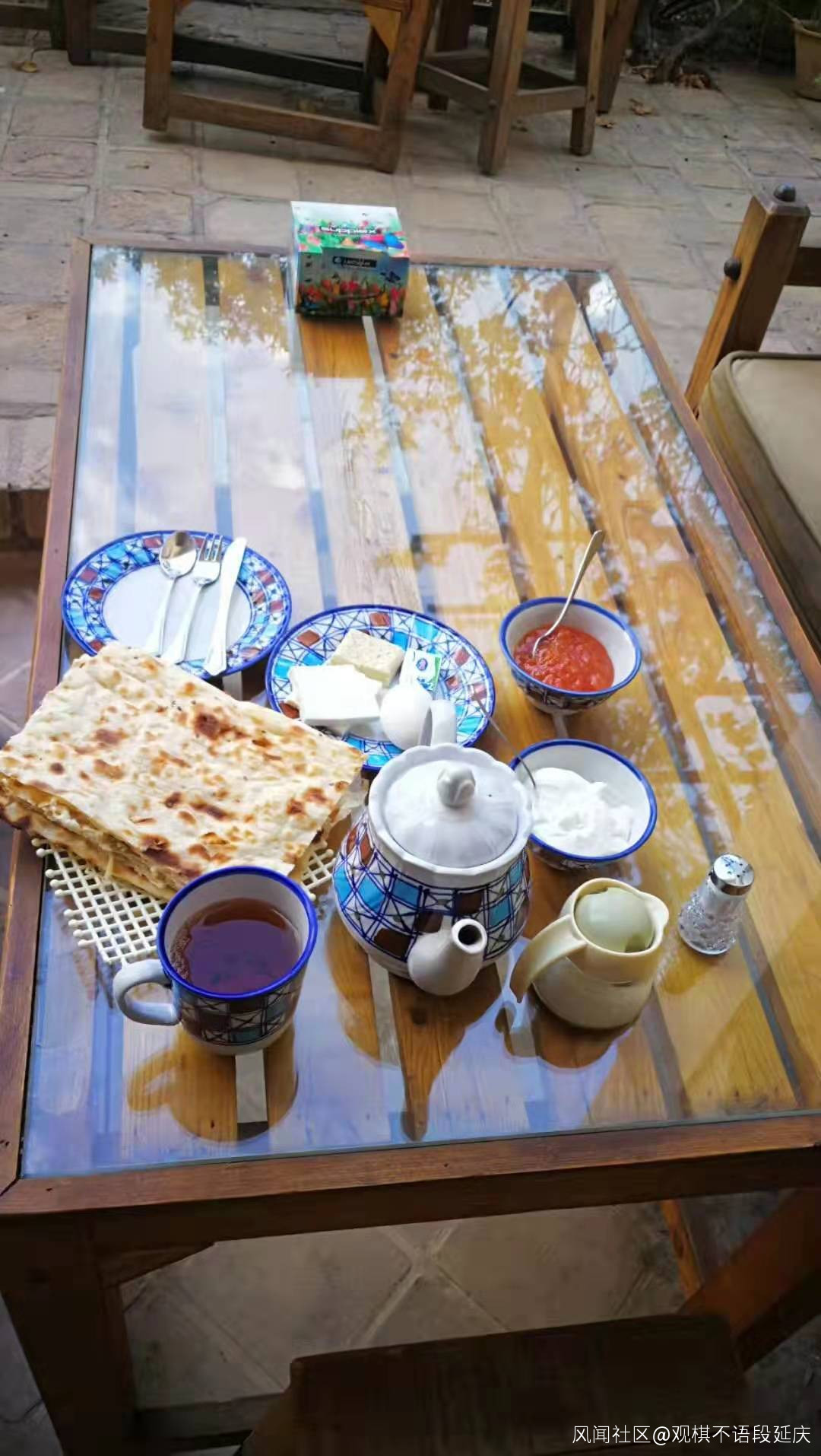 早餐是奶酪、大餅、煮雞蛋、果醬和紅茶,很簡單,但是伊朗人用大托盤運來一大堆盤子和碗,感覺他們這方面儀式感很強。