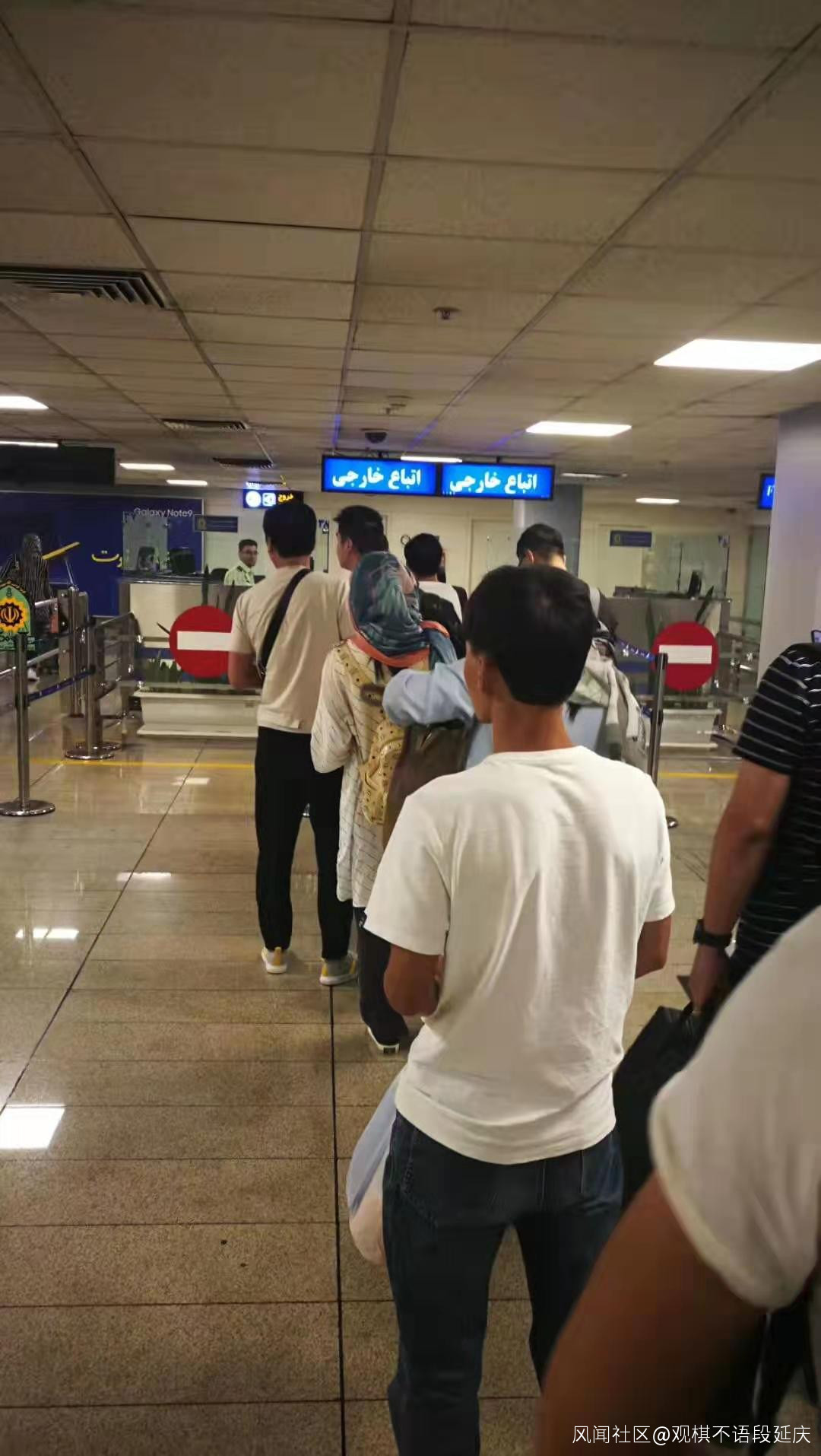 21:30降落 德黑蘭機場,比預定時間提前了20分鐘。機場不大,只需200~300多米便走到了入境邊檢。和我同機去的兩個 中國小姐姐,一個要到伊朗 再買頭巾,還有一個頭巾裝在行李裏,行李託運了,結果剛走上廊橋,就都直接被伊朗地勤趕回了飛機。南航空姐有經驗,直接贈送了每人一條毛毯,於是,在30℃的深夜,她們頂着保温性能很棒的南航毛毯,踏上了德黑蘭這片熱土。