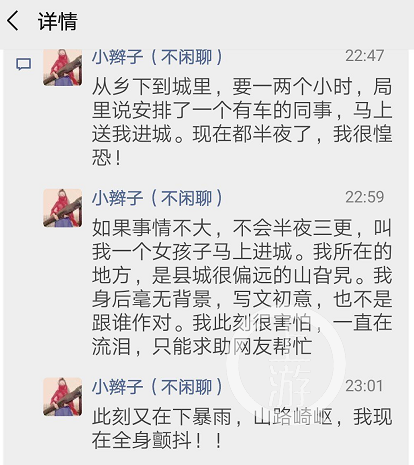 李田田解釋:“如果事情不大,不會半夜三更,叫我一個女孩子馬上進城。我所在的地方是很偏遠的山旮旯。我身後毫無背景,寫文初意,也不是跟誰作對。我此刻很害怕,一直在流淚,只能求助網友幫忙。”