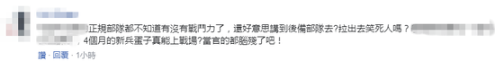 台軍方的“誇誇其談”引來島內一片噓聲,有網友表示“(台軍)正規部隊都不知道有沒有戰鬥力了,還好意思講到後備部隊去?拉出去笑死人嗎?4個月的新兵蛋子真能上戰場?當官的都腦殘了吧!”“只當兵4個月,後備軍人,連打靶應該沒幾次。”“你要不要先看看正式部隊能不能打?現在有空説後備(戰力)?”