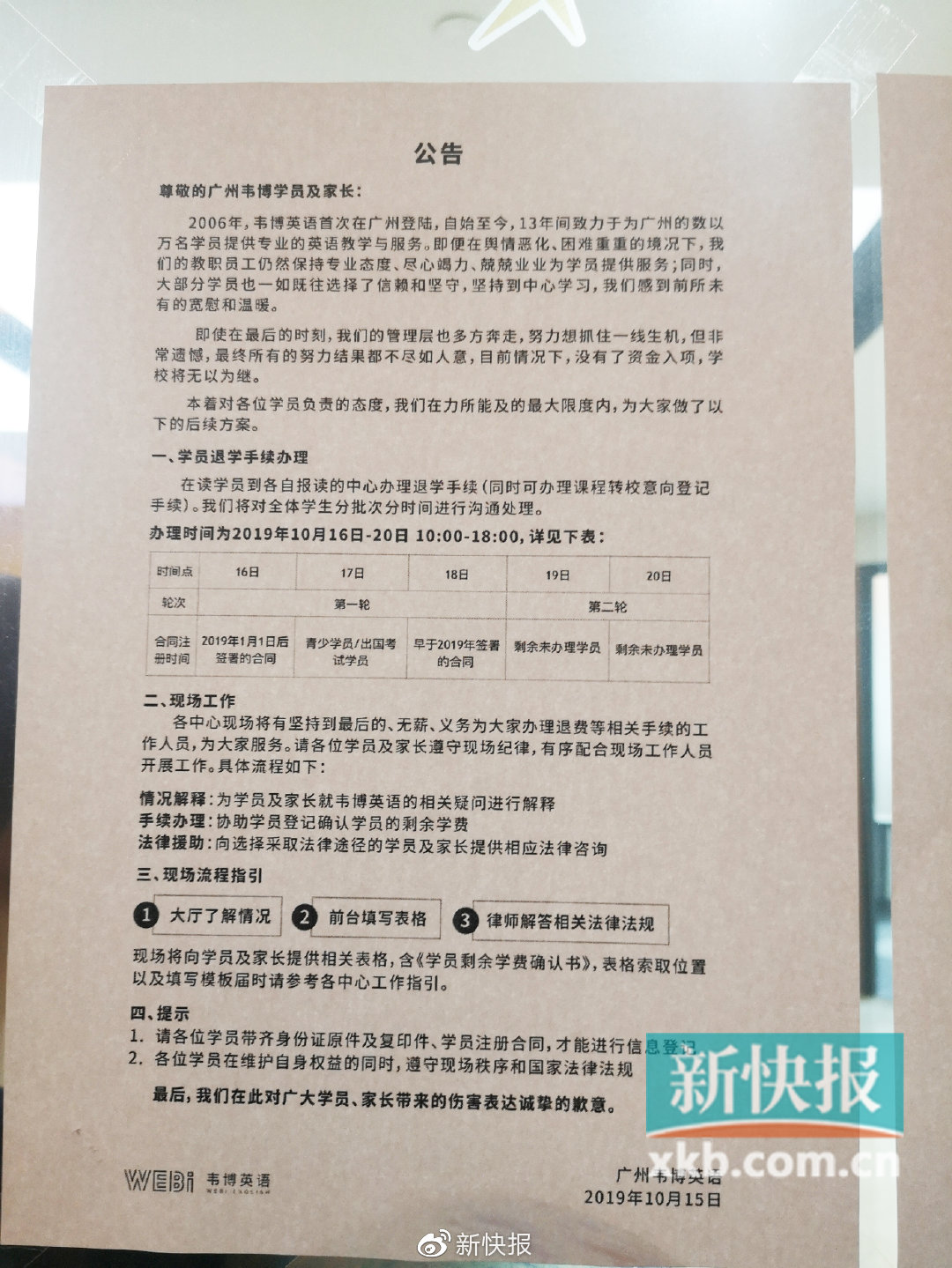 廣州韋博英語發公告稱不再繼續辦學 將為學員分批次辦理退學手續_風聞