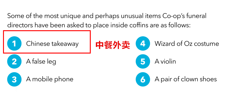 ▲在調研對象們想選擇的不同尋常的隨葬品中,“中餐外賣”高居榜首 (截圖via Funeral trends - Media report 2019)