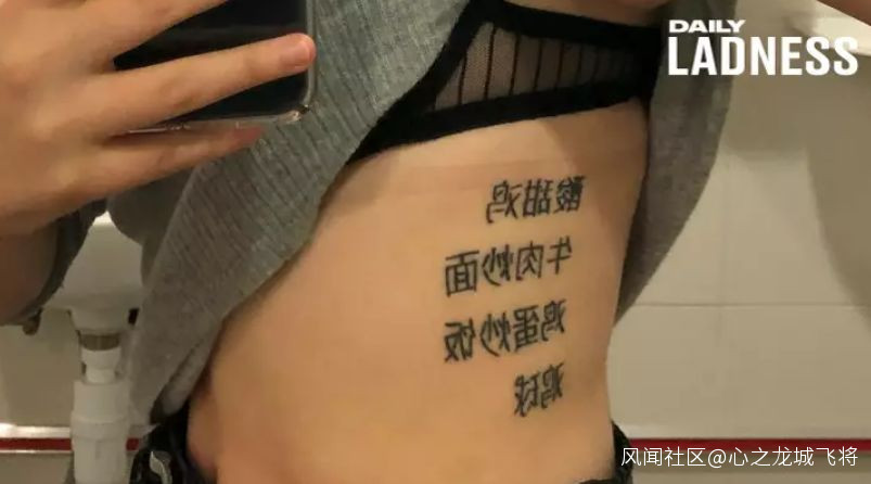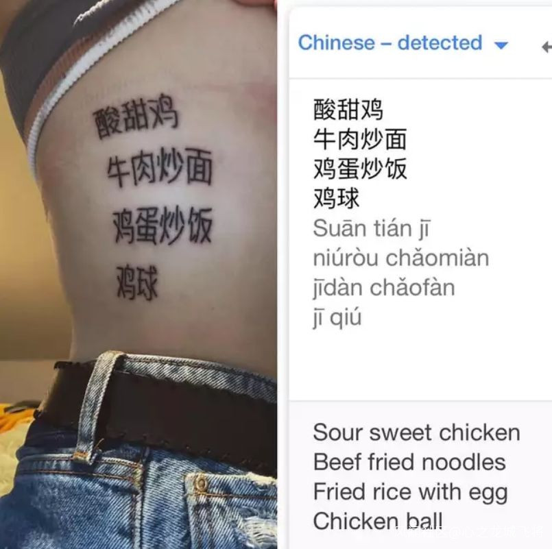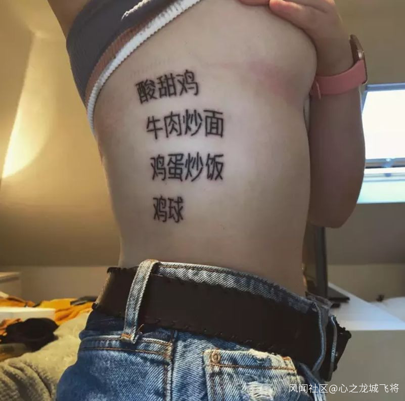 於是,姑娘真在身上紋了**“牛肉炒麪”“雞蛋炒飯”**等中文字……