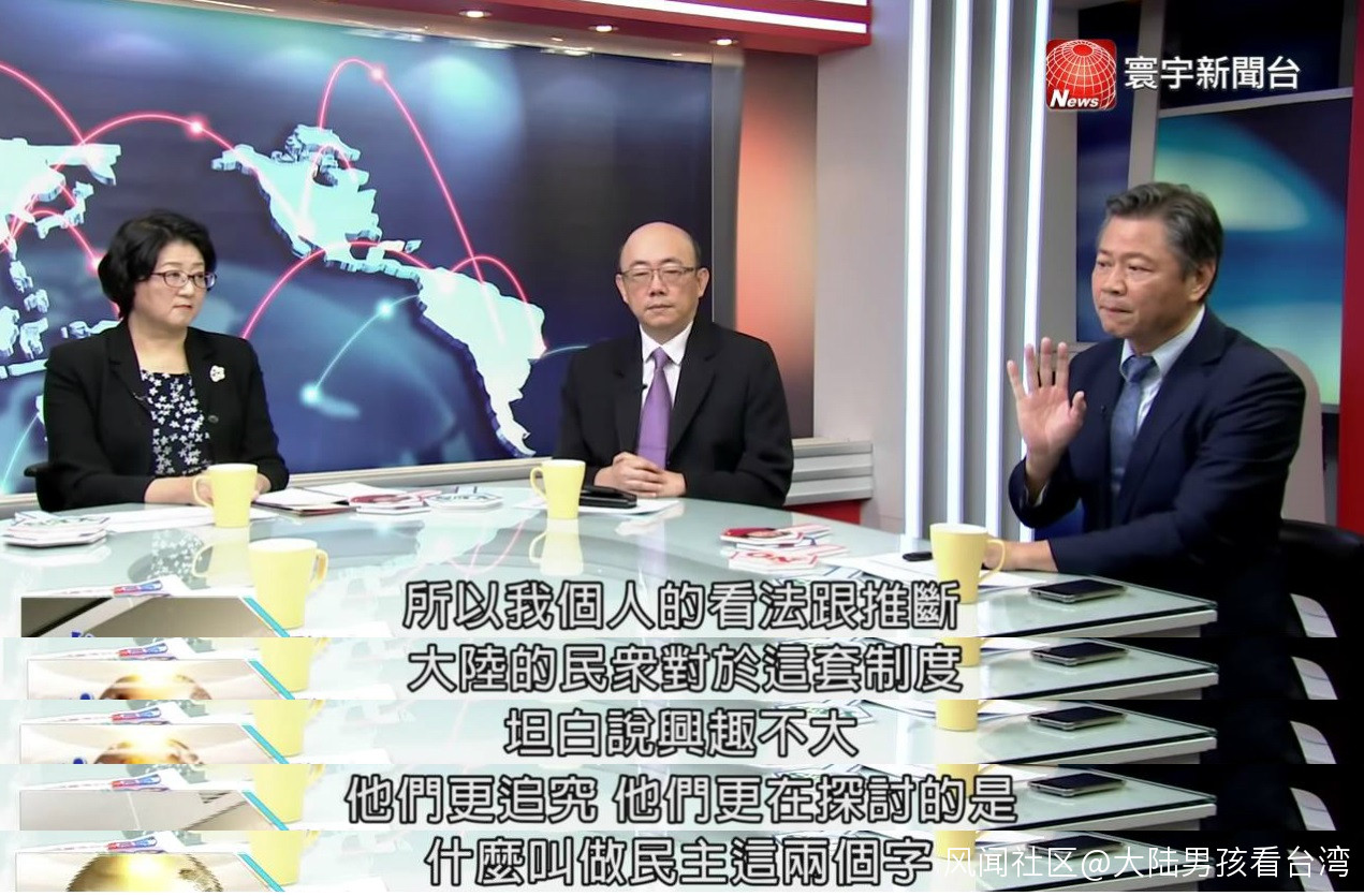 最後面,賴嶽謙給出結論,他觀察認為大陸民眾對於西方式的民主興趣不大,大家更希望去了解和探討的是“民主”這兩個字是什麼。