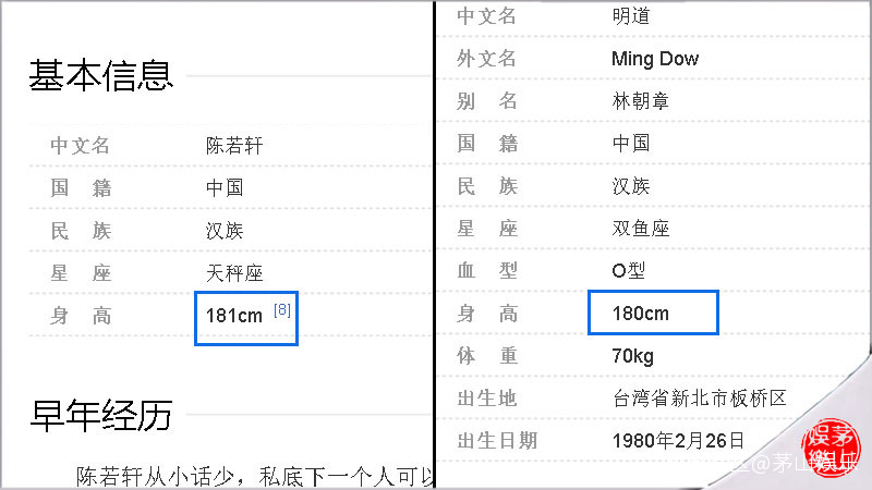 資料圖或許有網友會説,這有什麼奇怪的,就説明明道比陳若軒高嘛。但是,公開資料卻不是這樣的,陳若軒百科上有來自權威媒體報道的資料顯示他的身高為181cm,而明道的身高則是180cm,也就是説公開資料上明明是陳若軒比明道高了1cm嘛。而事實上有圖有真相,真相就是明道不但不比陳若軒矮,相反還高過他好幾個公分。雖説明星們,尤其是男明星的身高也是謎一樣的,但沒有對比就沒有傷害啊。