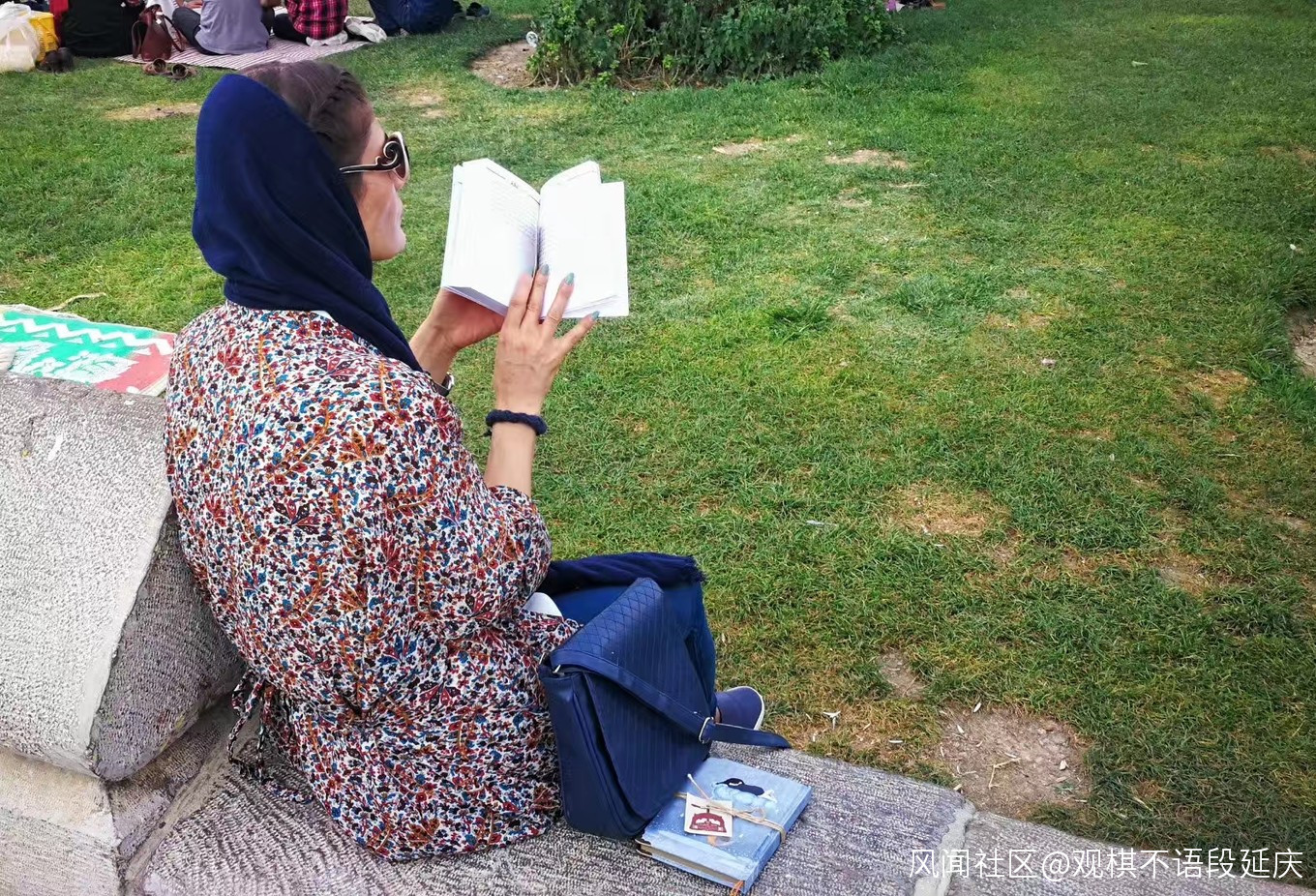 伊瑪目廣場,一位女士優雅的打開書,翻到書籤鎖定的位置,不過,大姐沒摘墨鏡🕶 啊