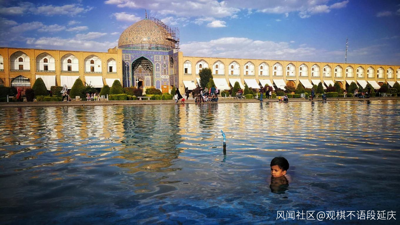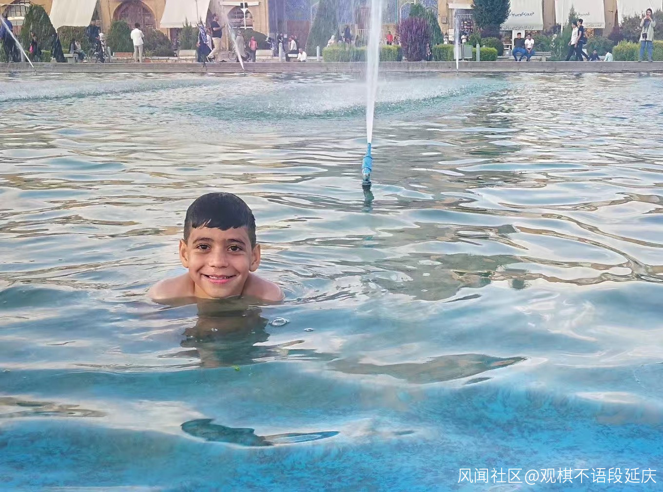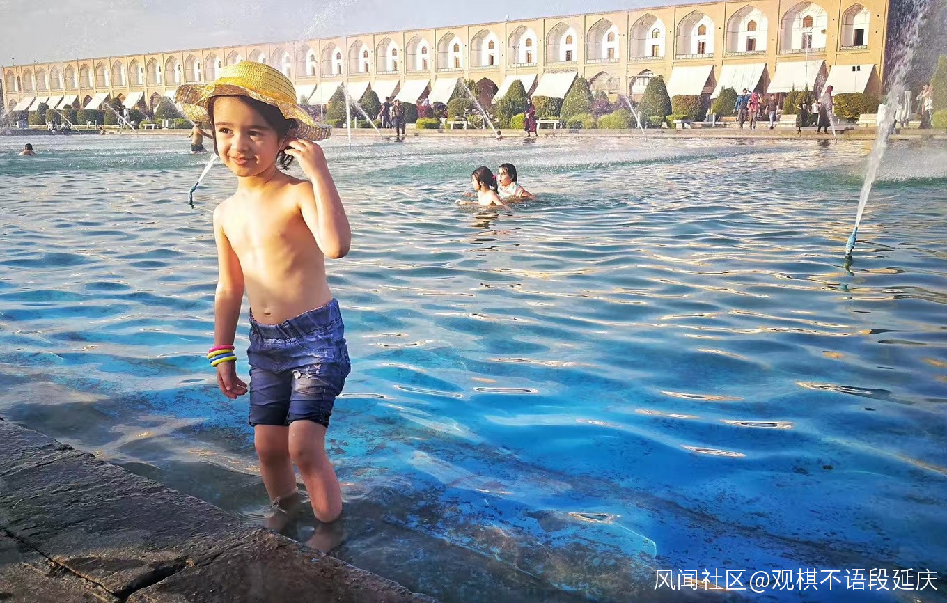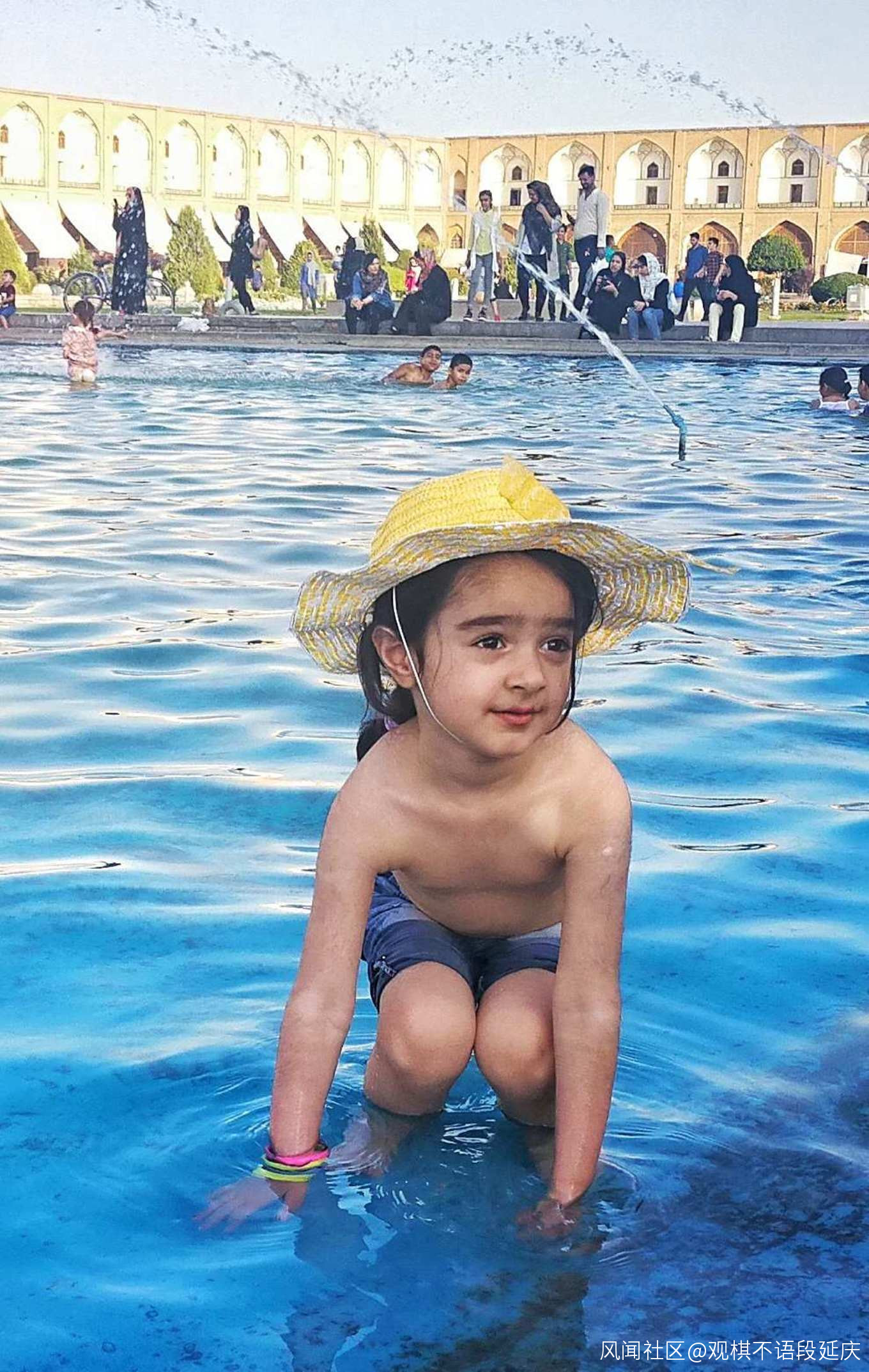伊瑪目廣場,一個小戲精,在不到30公分的水池邊緣,假裝游泳